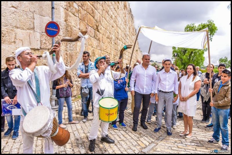 מעגל מתופפים וכלי נשיפה בדרך לטקס בכותל